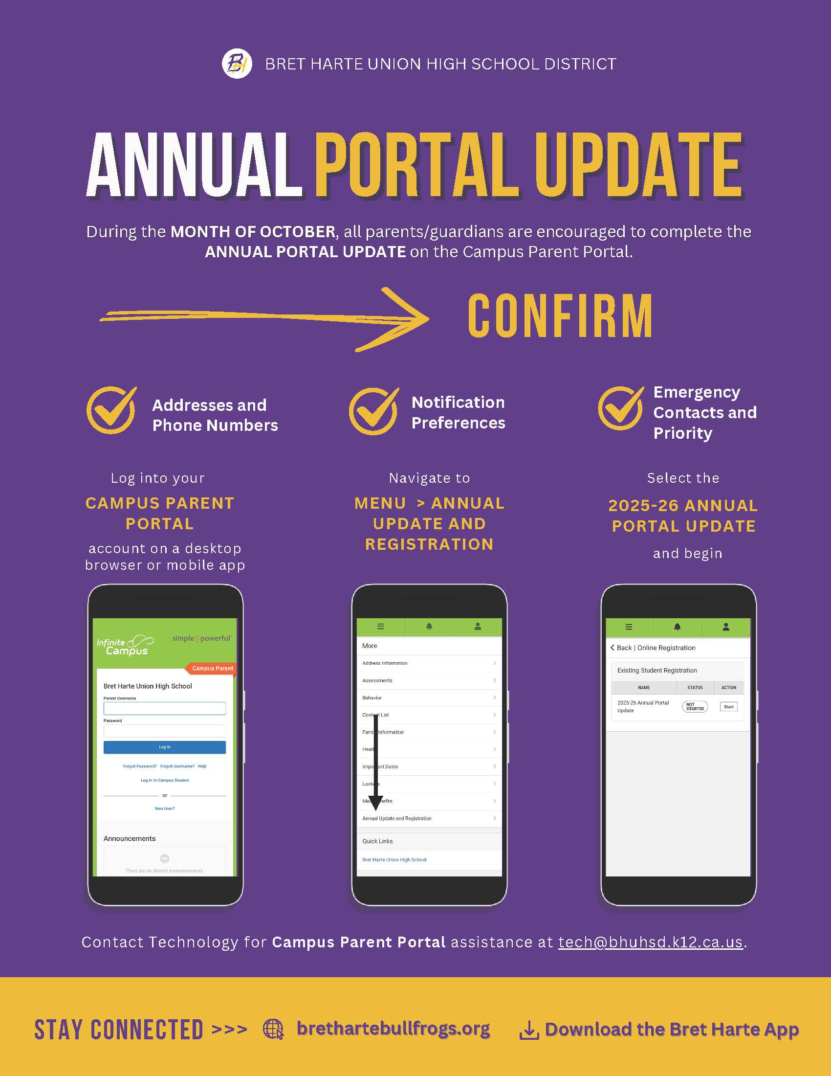 Bret Harte’s Fall Rivalry Week is next week – October 27 – 31! Show your school spirit with daily dress-up and participation in lunchtime activities. The week will conclude under the Friday Night Lights when our football teams host Calaveras. Game times are 5:00p JV followed by varsity at 7:00 PM. Be sure to wear your purple and gold!