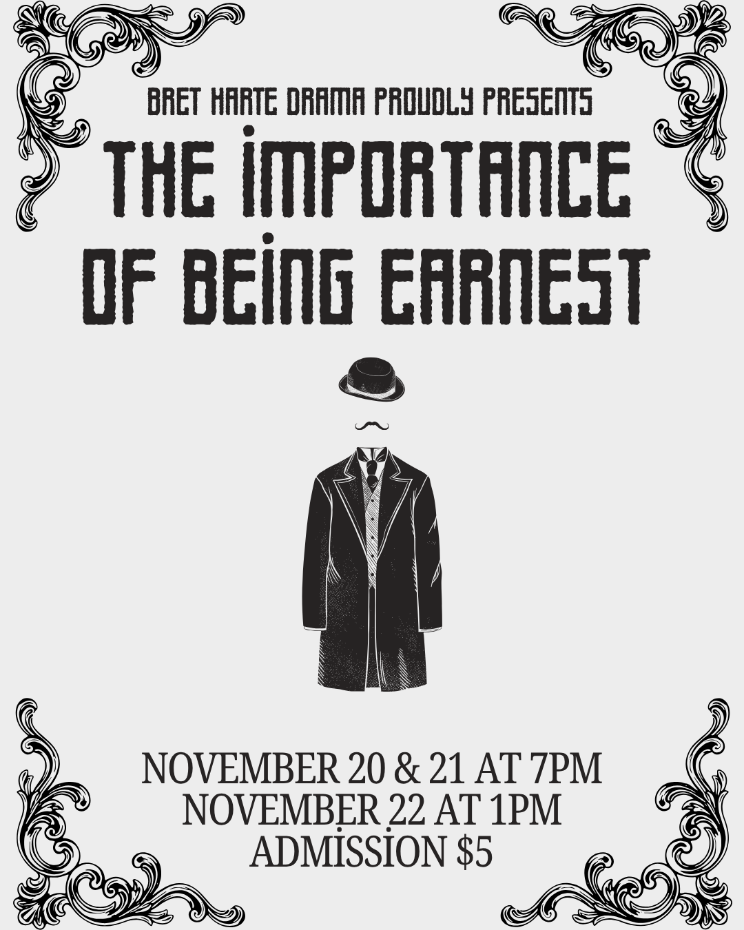 Wit, romance, and mistaken identity collide in Oscar Wilde’s timeless comedy The Importance of Being Earnest. Join Bret Harte Drama Nov 20–22 for an evening (or afternoon!) of sharp dialogue and hilarious twists. Don’t miss this charming satire of Victorian society! |